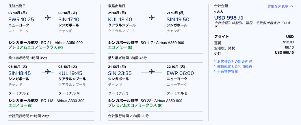 今回はシンガポール航空の格安プレエコ案件、ニューヨーク(ニューアーク空港)からクアラルンプールのプレエコ案件をご紹介。