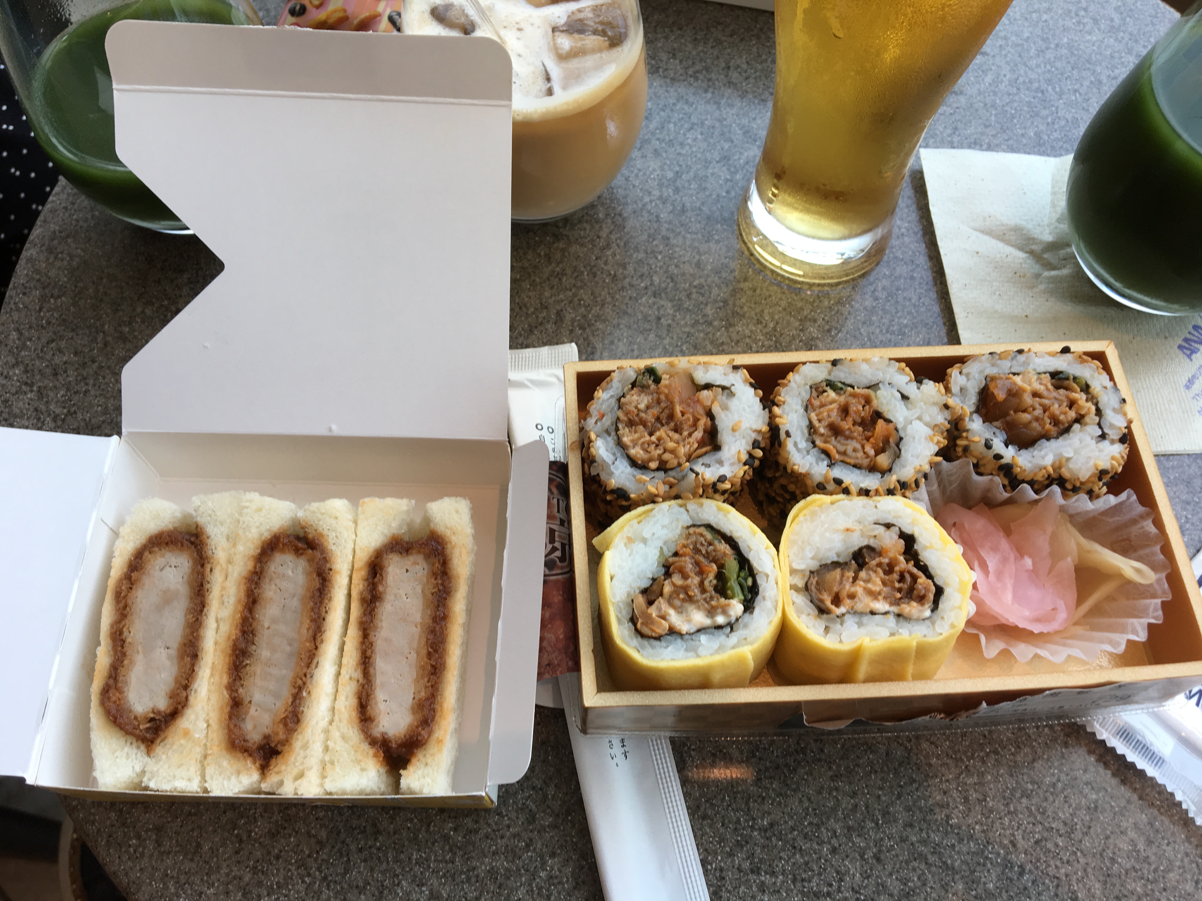 この焼肉巻き、中に焼肉が入ってて、5個のうち2個は薄い卵焼きで巻かれてて、後の3つは海外の寿司ロールにありがちな胡麻がついてるタイプ!(海苔が嫌いな人向けの。私それは結構好きなんです)