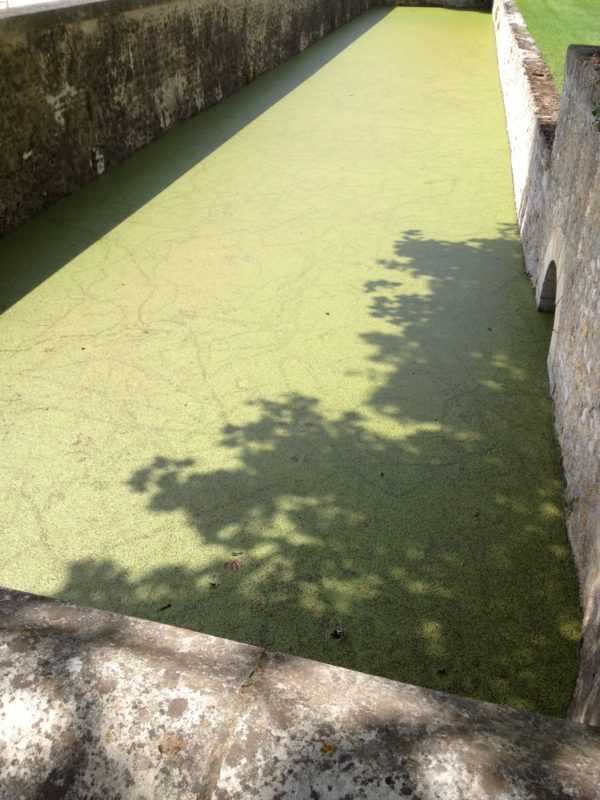 これ、水面に藻が。思わず小石を投げ入れてみると、普通にチャポンという感じでした。