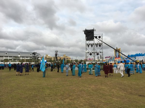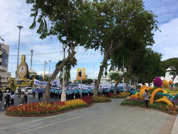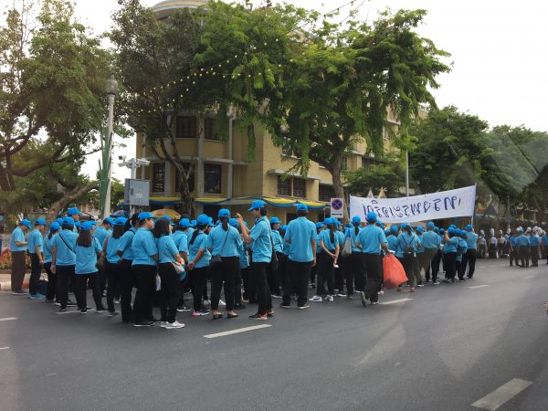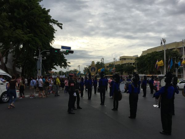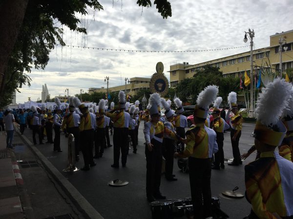 そして女の子たちも旗を回しながら、その後を軍隊とか学生の列が続いてサナムルアン公園の方に入っていくところです。