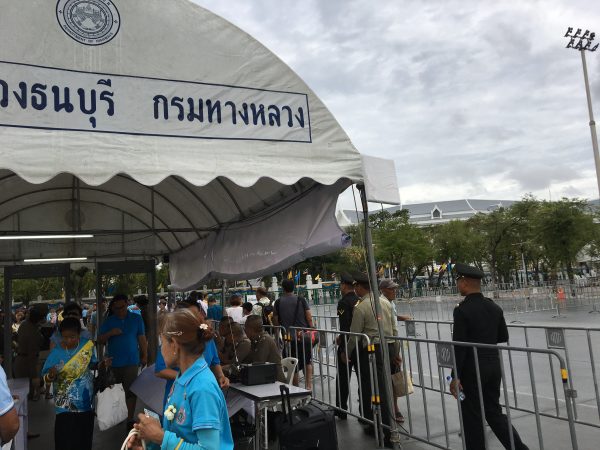 いよいよお車が近づく時間帯になると、警官たちがメガホンで「写真は絶対禁止!」と言ってたみたいです。タイ語なのですが、例えば後ろのオランダ人らしき家族も私の友人の彼女に「no picture 」とジェスチャー付きで言われるなどして、何事か理解はできる感じです。