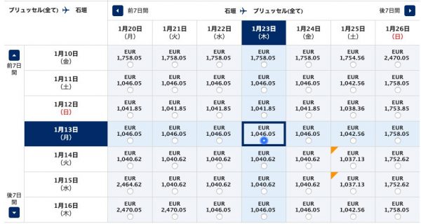 ブリュッセル発で安かった日程で見てみますと、こんな感じ。