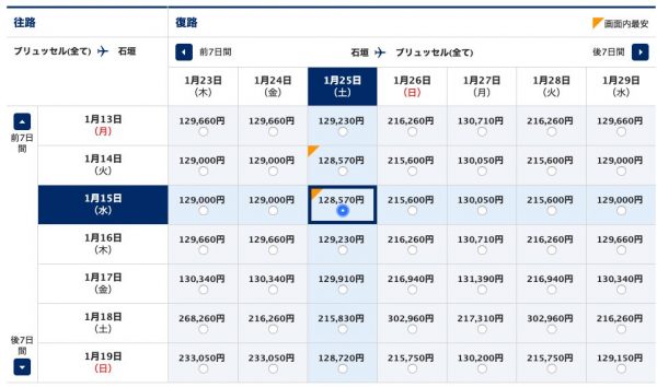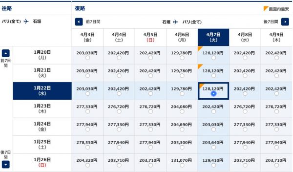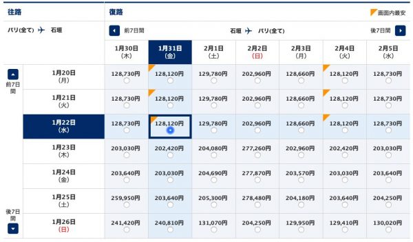 とりあえずこの1月から12月と、11ヶ月も対象期間となっているのですが、全ての日程が安いわけではないので、前後往復で見てみましょう。