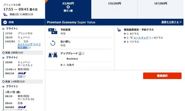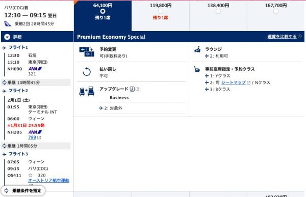 そしてその間の予約クラスがルフトハンザかオーストリア航空のBで、これはマイル積算率100%、ということはプレミアムポイントも同じだけつきます。