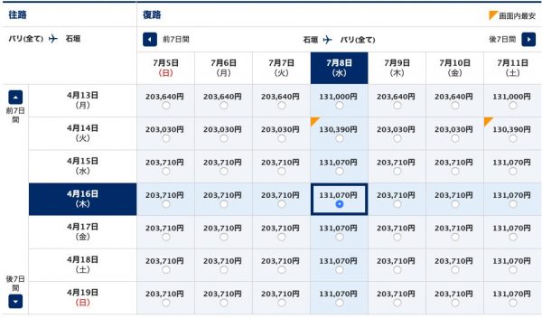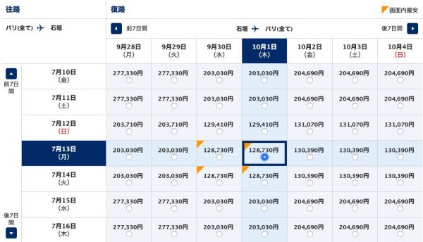 パリ発の往路で一番安いのはこういう感じで出てきたのですが