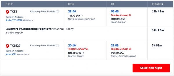 | 1月20日 | 日本発パリ(往路) | Turkish Airlines |