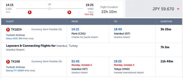 | 10月4日 | パリ発日本行き | Turkish Airlines |
